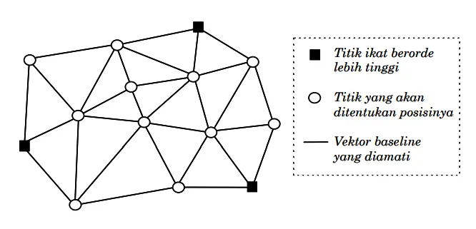 Pada praktiknya, survei ini dilakukan baseline per baseline pada suatu jaringan titik. Jika digunakan lebih dari dua receiver GNSS, maka pengamatan dapat dilakukan untuk beberapa baseline sekaligus dalam satu sesi.